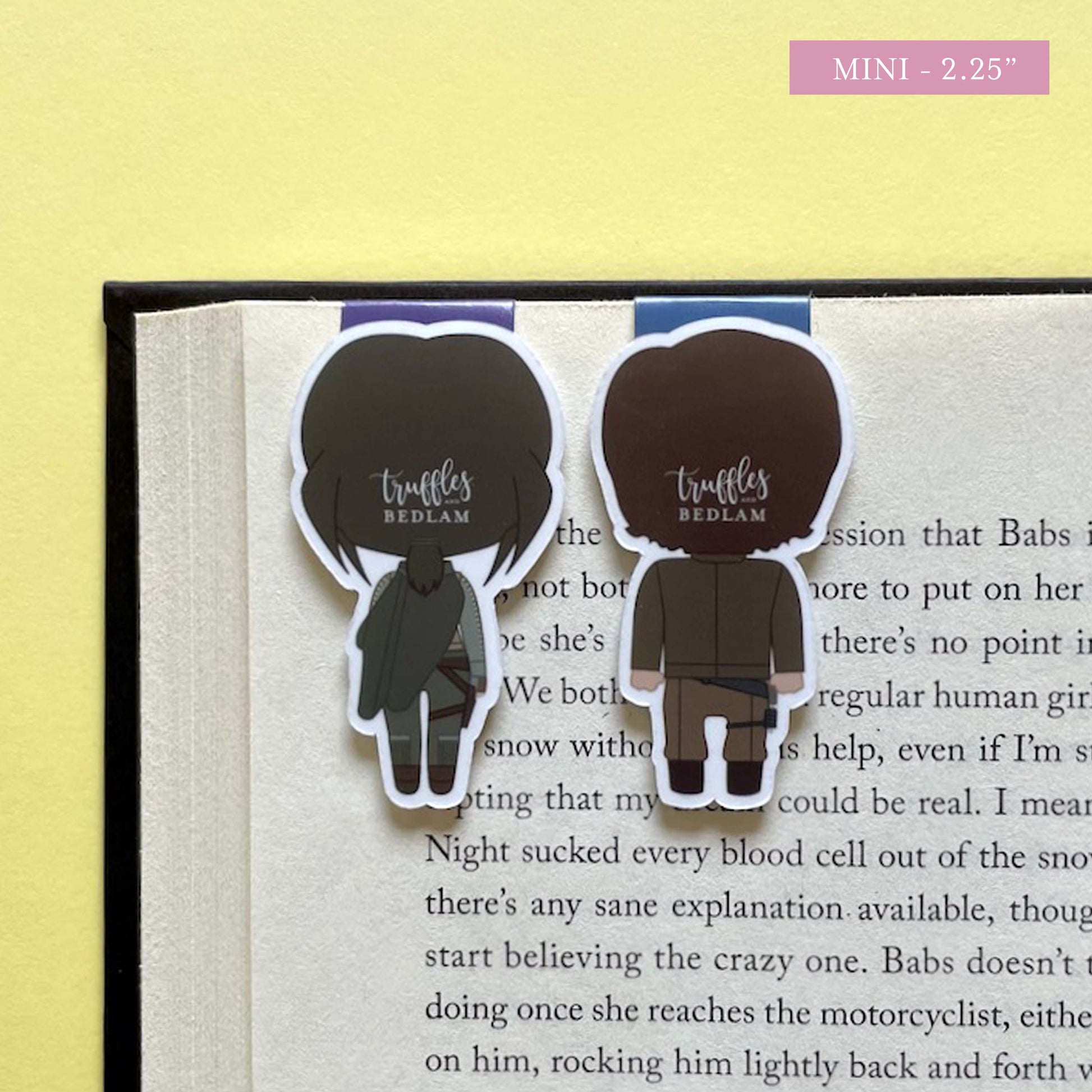 Our die-cut magnetic bookmarks are printed on premium photo paper, laminated in a protective matte vinyl to discourage flaking from overuse or wrinkling from getting wet, and held together with super strong magnets. They’re sturdy little things that are offered in two sizes when folded: Mini at just over 2.25 inches (5.7 cm) tall, and Mega at just over 3 inches (8 cm) tall.